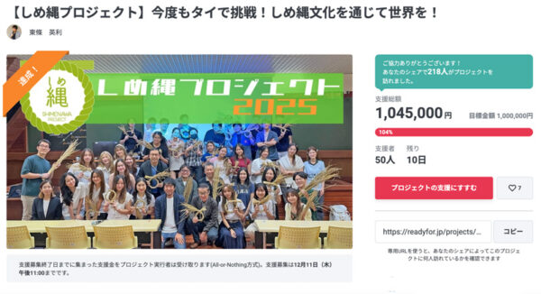 Readyforさまで挑戦しておりました「しめ縄プロジェクト2025 in タイ」ですが、この度、無事に目標を達成することができました。